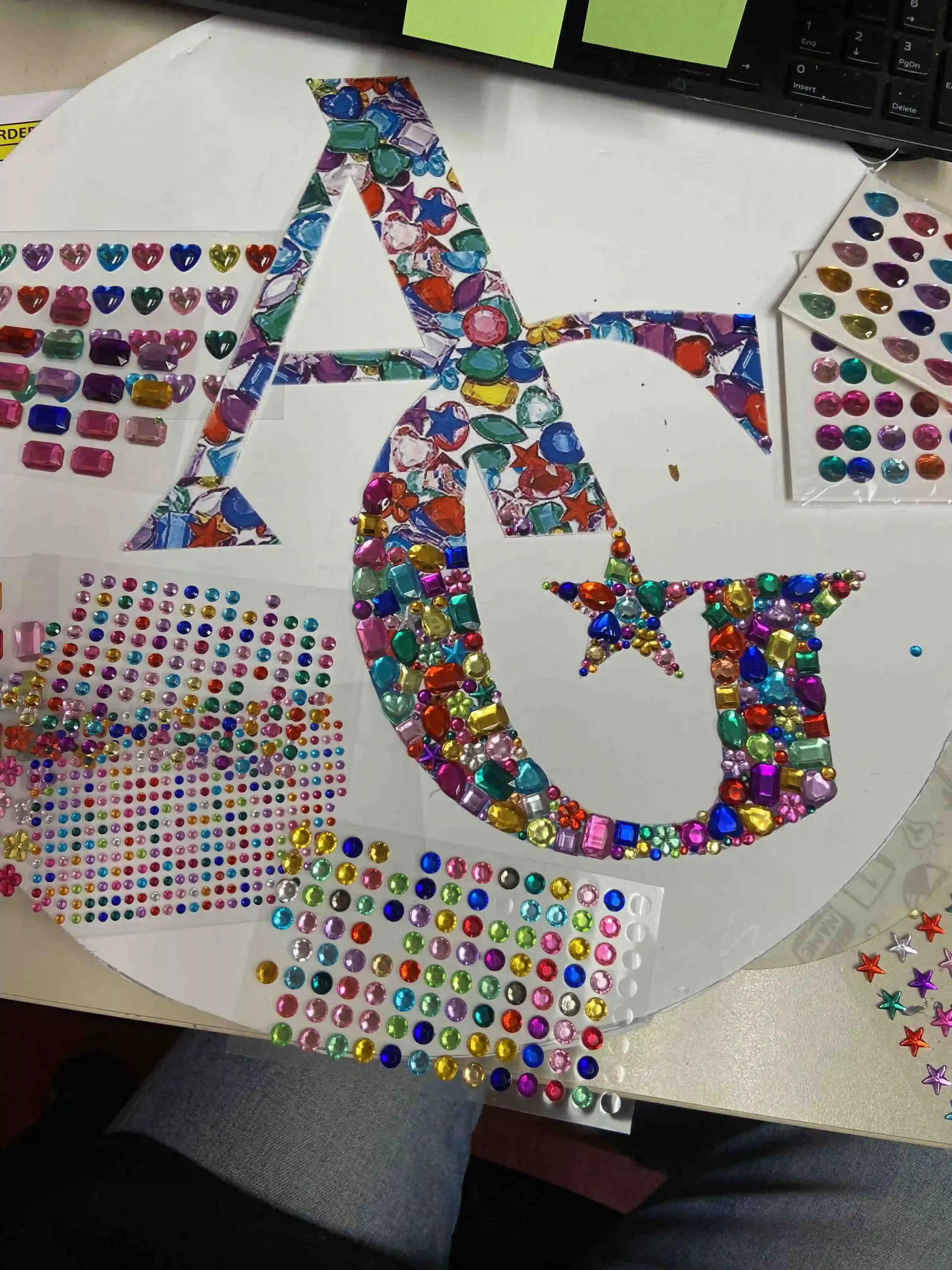 - Hand-applied hundreds of gemstones to form original American Girl logos and sparkling display accents.